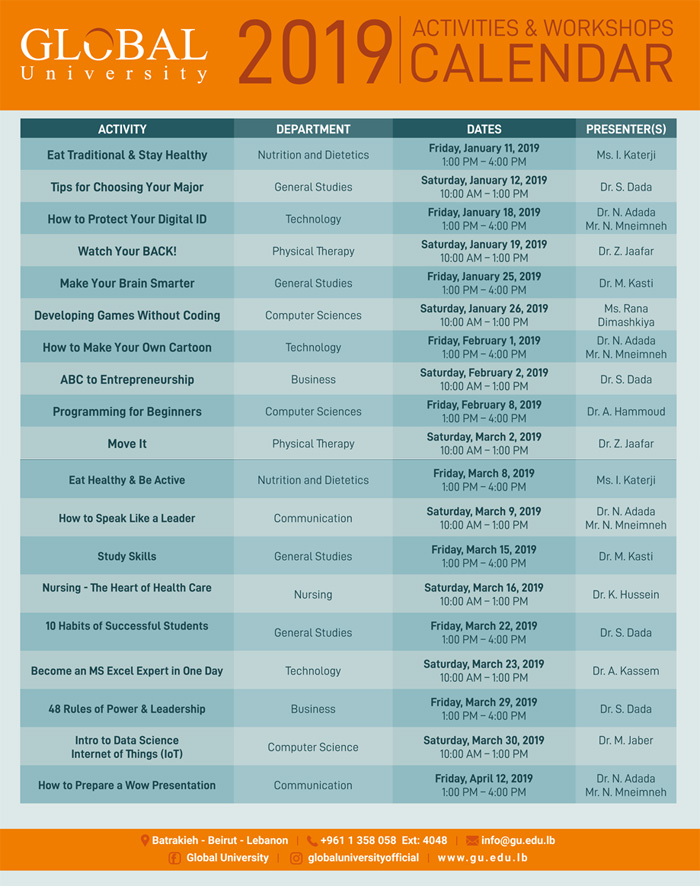 Workshops 2019 Calendar
