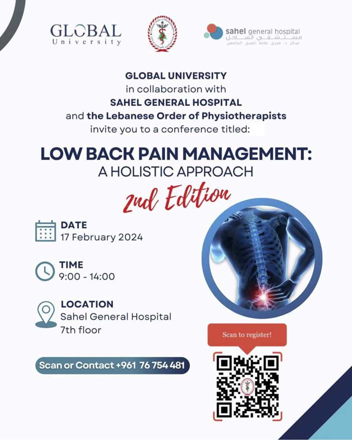 Global University collaborated with Sahel General Hospital and the Lebanese Order of Physiotherapists to host a conference titled "Low Back Pain Management: A Holistic Approach". Esteemed attendees included Dr. Fadi Alameh, Head of Sahel Hospital Group; Dr. Adnan Traboulsi, President of Global University; Dr. Sayde Yassine head of the Lebanese Order of Physiotherapists in Lebanon; Dr. Mazen Alameh, President of Sahel General Hospital; Dr. Badr Tabsh, VP of Global University; Dr. Zeinab Jaafar, Head of the Physical Therapy department at Global University, alongside other medical professionals and therapists from various hospitals and Lebanese universities.